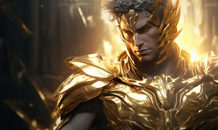 A muscular warrior with an intense expression is posed dramatically against a vivid orange background. His attire reflects a mythical theme, evoking images of ancient legends and battles.