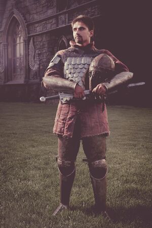 Medieval knight with the sword on the ancient castle background. Low contrast post processing.