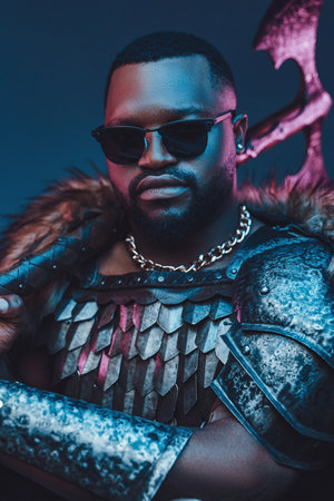 Dressed in light armour with fur scandinavian seafarer armed with two handed axe poses in dark background.