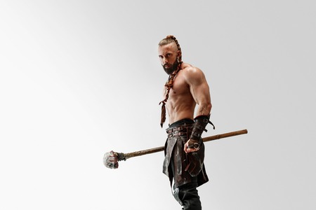 Serious long hair and muscular male model in leather vikings costume with the big mace cosplaying isolated on white studio background. Half-length portrait. Fantasy warrior, antique battle concept.