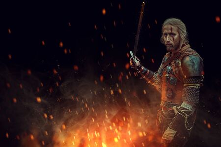 Scenic portrait of a brave medieval warrior in armor and with a sword. The Witcher man.