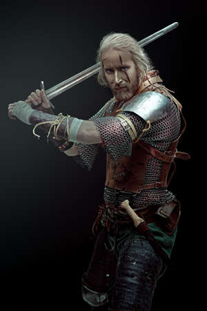 Portrait of a brave medieval warrior in armor with a sword on a black background. The Witcher man.