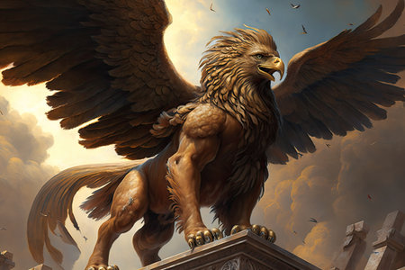 majestic griffin soaring through the sky, its wings beating gracefully, created with generative ai