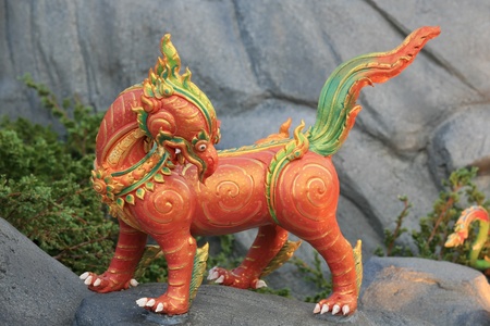 Ornament red animal sculpture like Lion standing on artificial rock at Royal funeral pyre for cremation ceremony of the HRH Princess Bejaratana Rajasuda