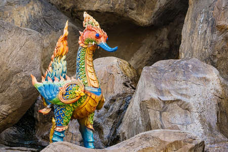 Nakhon Nayok, Thailand - April, 24, 2022 : Animal sculptures in Thai fairy tales at Maniwong Temple at Nakhon Nayok, Thailand.