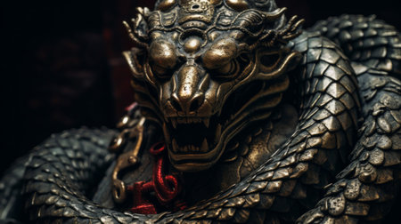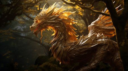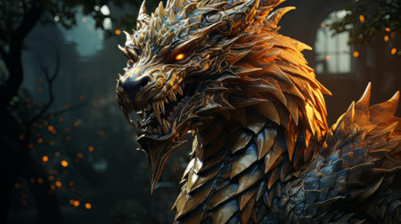 Golden dragon, scaly, with a bright metallic gold accent. Striking image of a golden dragon with a vibrant metallic scale accent.