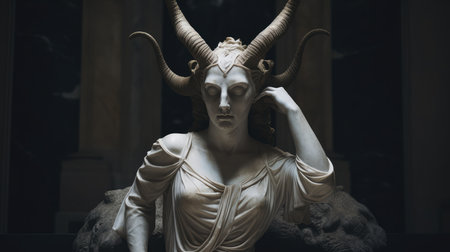 Ancient goddess. Statue of a woman with ram horns isolated on a dark background.