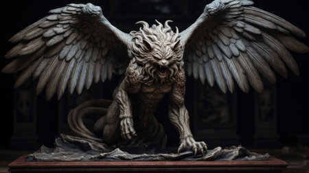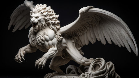 A winged lion with a fiery tail stands on a rock, its wings spread wide in a dramatic pose