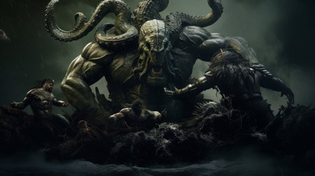 a demonic creature with large fangs and horns is depicted in this image, rendered in the style of unreal engine. the detailed atmospheric portrait showcases dark white tones and multi-layered textures. twisted branches add to the eerie atmosphere, while varied brushwork techniques create an eerily realistic effect. ai generated