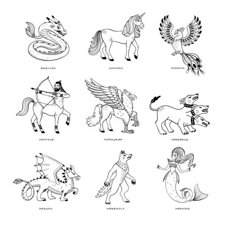 Magical creatures set. Mythological animals. Doodle style black and white vector illustration isolated on white background. Tattoo design or coloring page, Line Art