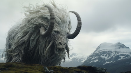 the memory, sorrow, and thorn trilogy portrait features a massive creature in the breathtaking norwegian landscape, inspired by the iconic style of tim walker. the 8k 3d image showcases unique character design and vampirecore-inspired animal features, creating a stunning and captivating visual experience. ai generated
