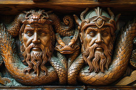 Wooden dragon heads on the wall of a wooden house in Prague, Czech Republic
