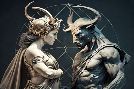 An AI generated illustration of two ancient greek-style statues, depicting the gemini and taurus relationship in astrology