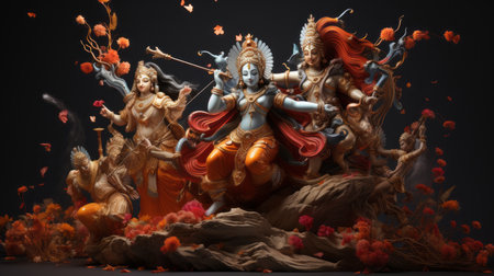 A serene image of Lord Rama holding his bow, with soft light illuminating the intricate details of the statue.