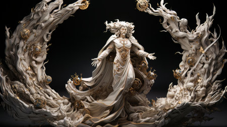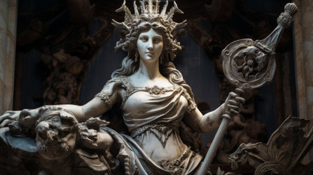 Powerful goddess holds majestic scepter shield with detailed motifs