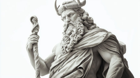 sculpture presents Ve a prominent Scandinavian god with intricate details highlighting his majestic horns and expressive facial features set against a plain white backdrop.