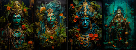 collage of 4 photos. Traditional Indian painting of Lord Shiva holding a bell. A detailed piece of art that demonstrates cultural and religious significance. Hand painted by experienced artists.