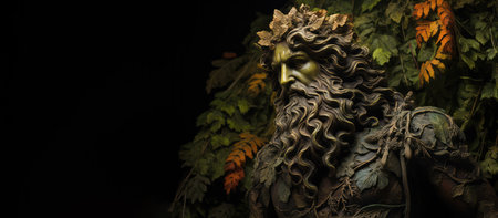 Ancient god. Statue of a male god with ram horns on a dark background.