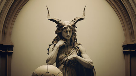 Ancient goddess. Statue of a woman with ram horns isolated on a dark background.