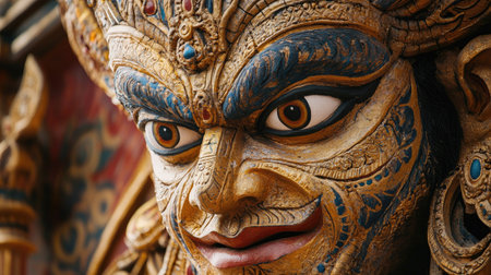 This close-up image captures the intricate details of a mythical face carving. The artwork showcases exquisite textures and an expressive form, highlighting cultural heritage.