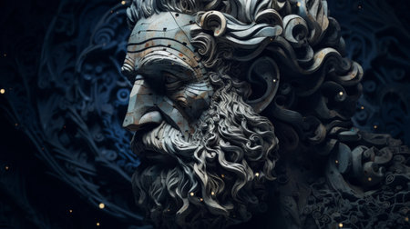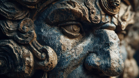 A close-up view presents an antique stone carving of a male face. The sculpture features textured hair and a detailed beard, with visible wear and tear. The color palette includes gray and blue tones, suggesting an outdoor setting. This image is suitable for various commercial or editorial applications.
