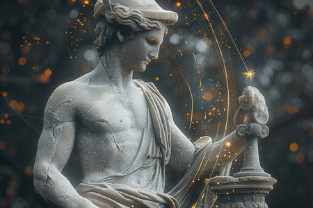 Close-up of an ancient marble statue with intricate details, showcasing classical artistry against a dark background