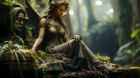 Angel statue in the forest. Conceptual image. 3D rendering.