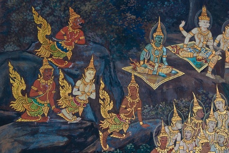 ramayana painting set on the wall of temple in thailand