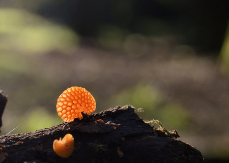 Orange mushroom ,Champagne mushroom or eyelash cup mushroom with sparkling droplets in the forest. Ecosystem or biological diversity concept.