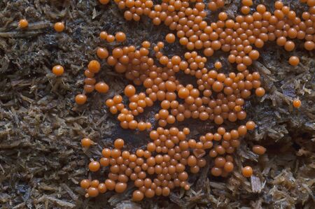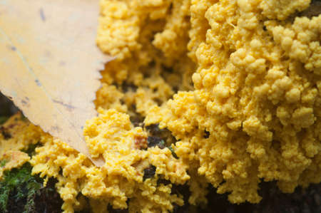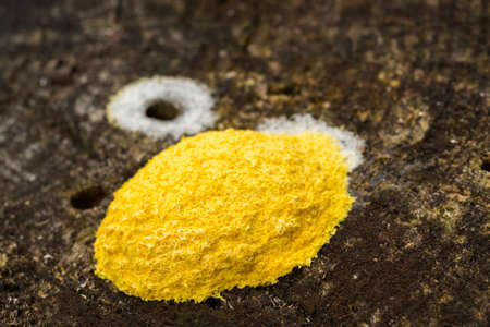 Slime molds. Slime mold - physarum viride. Yellow small protist organism
