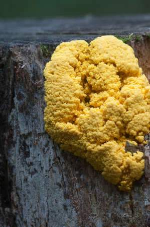 Fuligo septica mushrooms (slime mould) on an old stump