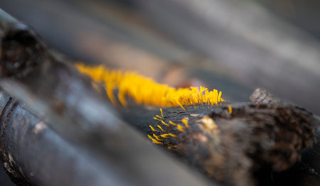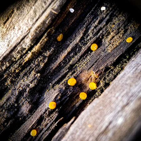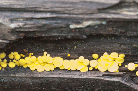 Very small fungus yellow fairy cups or lemon discos, Bisporella citrina, on old wet wood macro texture, selective focus, shallow DOF.