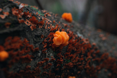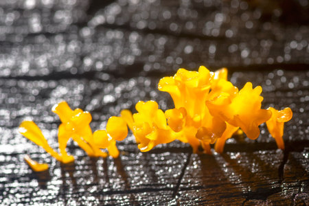 Group of orange jelly fungus, fan shaped jelly fungus, Dacryopinax spathularia on wet and old brown rotten log, selective fucus, top view, Thailand.