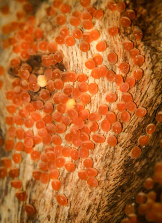 Mini orange mushroom and spore on the moist wood, in rainy season