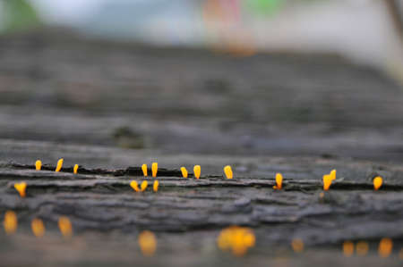 yellow tiny mushroom growth on an old wooden. The dart to get rain soon.