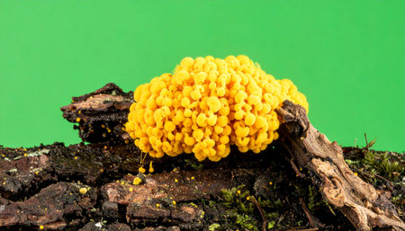 A vivid yellow mass of Fuligo septica, commonly known as dog vomit slime mold, thrives on a piece of decaying bark. Isolated against a stark green background, this image captures the fascinating and alien-like beauty of protist life, perfect for scientific, educational, or creative projects.