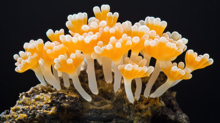 Close-up of a colony of colorful orange and white coral polyps, showcasing their delicate structure and lively appearance as they extend from a rocky base.
