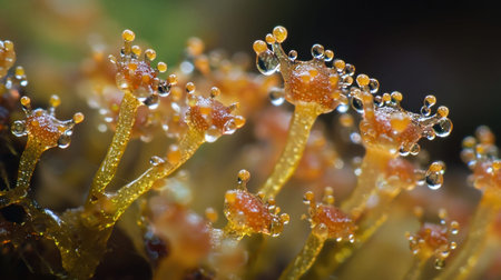 A detailed macro shot of a sundew plant, highlighting its sticky tentacles and water droplets, capturing the essence of natures design.