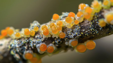 A macro photograph showcases a section of a tree branch covered in a cluster of vibrant orange lichen. The lichen is in full bloom, showcasing its intricate, spherical shape. The branch is covered in moss and other lichen species, creating a diverse and textured background.