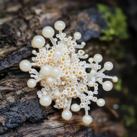 Clusters of Lycogala epidendrum, resembling small pinkish spheres, grow on decaying wood, thriving in a forest environment during warm, humid summer conditions.