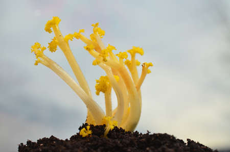 Shoots of young plants of yellow color from under the earth stretch towards the sky