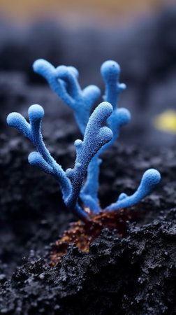 the close-up shot of a flower in the style of cellular formations is a stunning masterpiece. the dark background highlights the light silver and navy hues of the petals, creating a whimsical wilderness effect. this national geographic photo is a perfect example of mushroomcore, showcasing the beauty of nature in a unique way. the realistic still life with dramatic lighting adds depth and dimension to