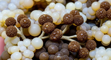 a close-up portrait photograph showcasing the intricate details of unknown escherichia coli biological virus alien flowers. the image captures the brittle yet beautiful essence of these flowers, with dry and elegant petals. the rich and vivid contrast, along with the depth of field and black tones, creates a crisp and realistic depiction. shot on a 100mm lens with an aperture of f/2.0, the natural lighting