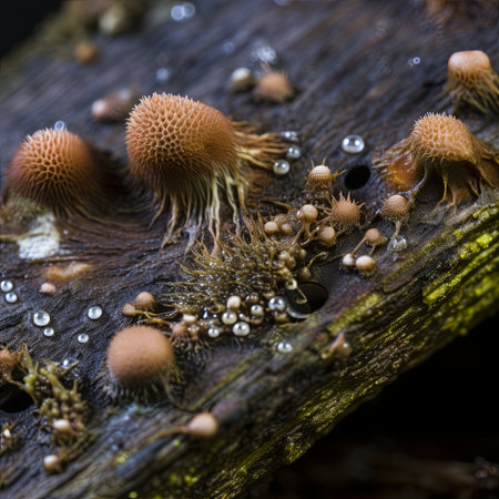 A stunning macro shot reveals intricate details of fungi and moisture droplets on decaying wood. This image beautifully captures nature s decomposition and the delicate balance of ecosystems.