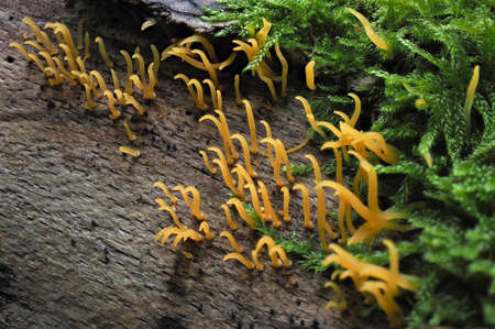 Close up of Orange Mushroom, scientific name Dacryopinax Spathularia in the nature.