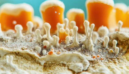 Orange mold growing on a white surface with a blue background
