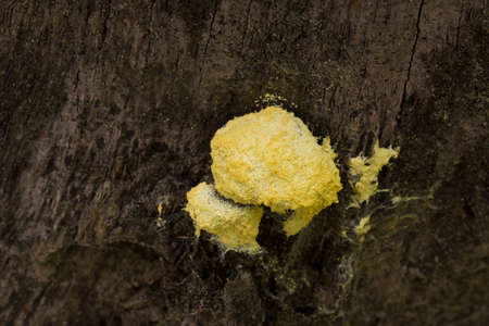 Fuligo septica, slime mold, scrambled egg slime fungus on tree stump closeup selective focus