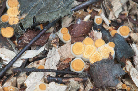 Crucibulum laeve mushrooms on the autumn leaves, candid