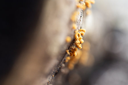 Macro of Yellow Tremella mesenterica fungus growing on dark tree bark in forest habitat. Bright jelly like mushroom structure highlights biodiversity and natural woodland micro ecosystem.
