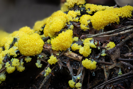 Slime molds. Slime mold - physarum viride. Yellow small protist organism